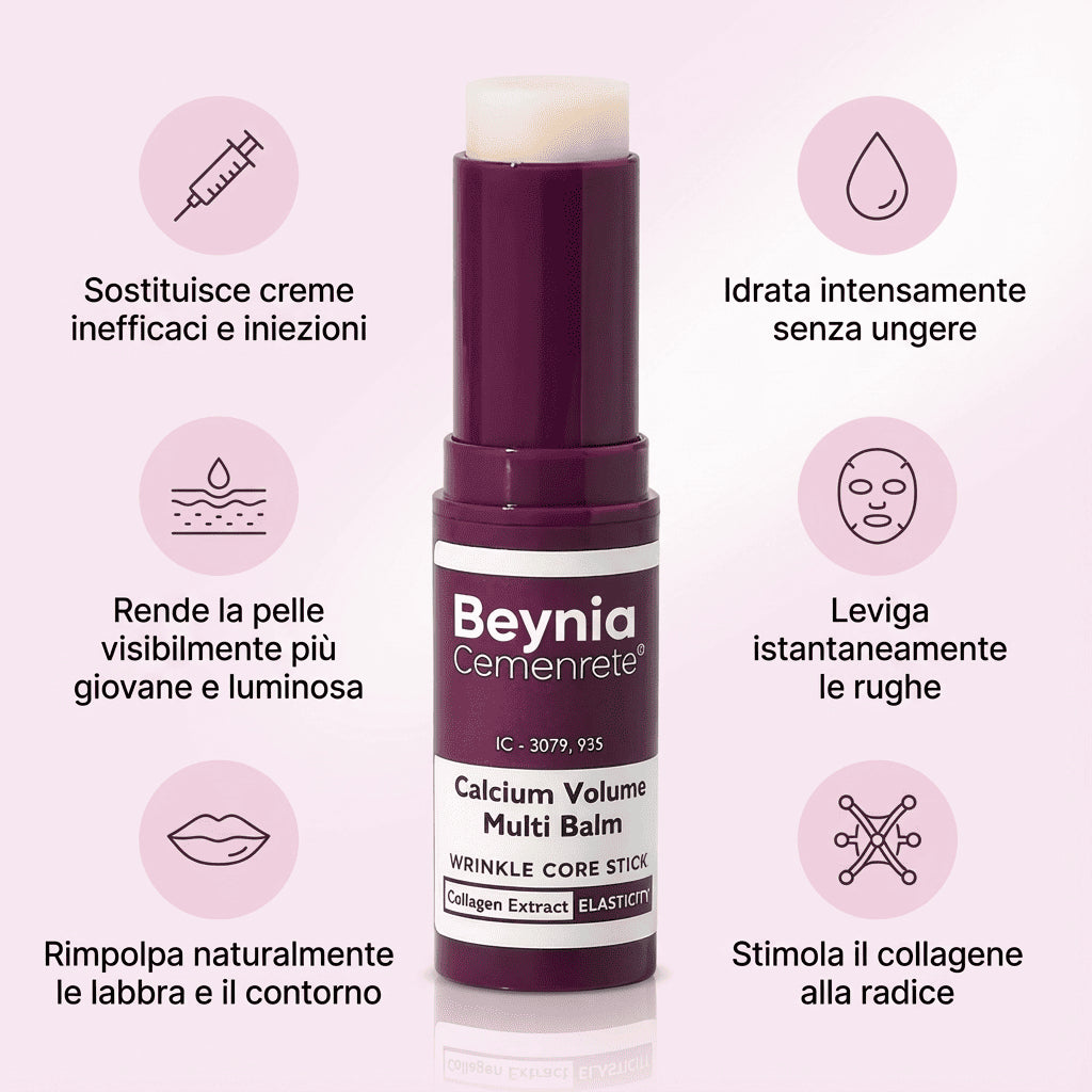 Il BeyniaBalm™ riattiva le riserve naturali di calcio e collagene della pelle, aiutando a levigare visibilmente le rughe e le linee sottili, soprattutto nella zona del contorno labbra.